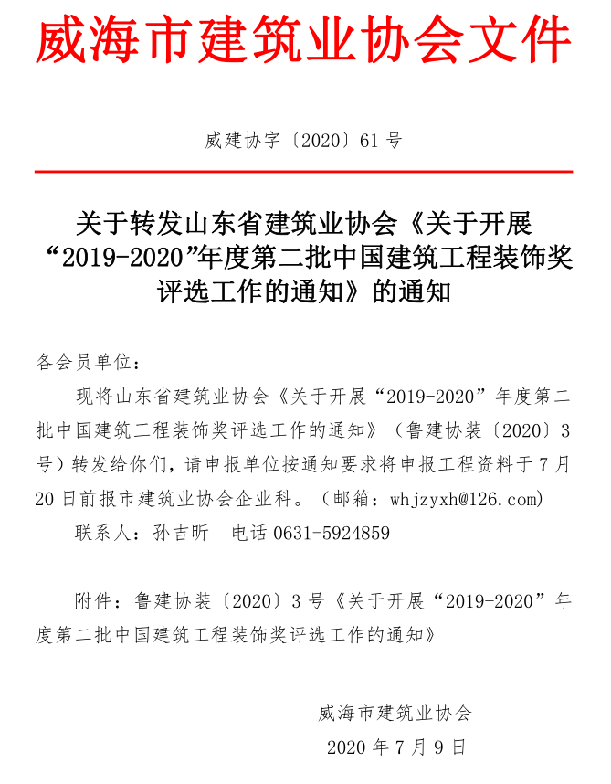 關(guān)于轉(zhuǎn)發(fā)山東省建筑業(yè)協(xié)會(huì)《關(guān)于開展“2019-2020”年度第二批中國建筑工程裝飾獎(jiǎng)評選工作的通知》的通知