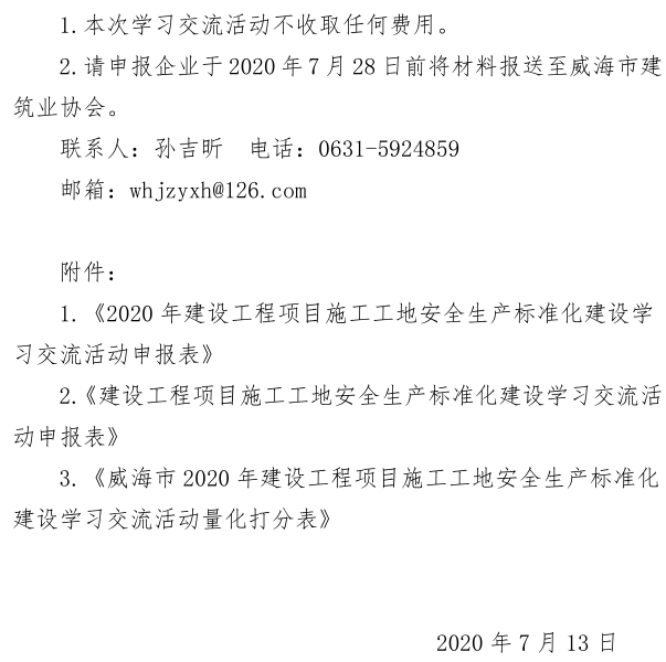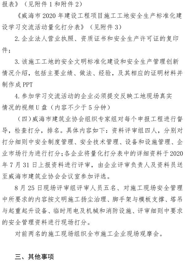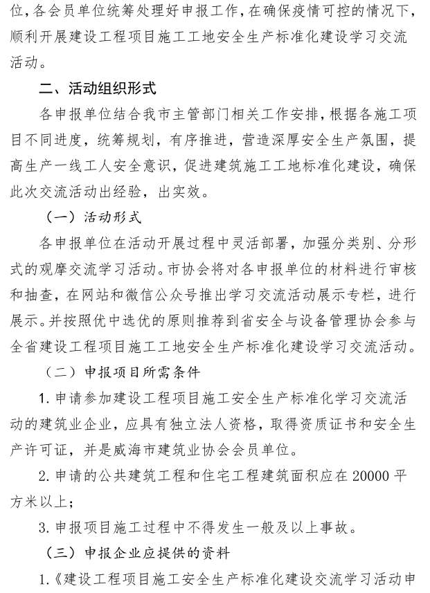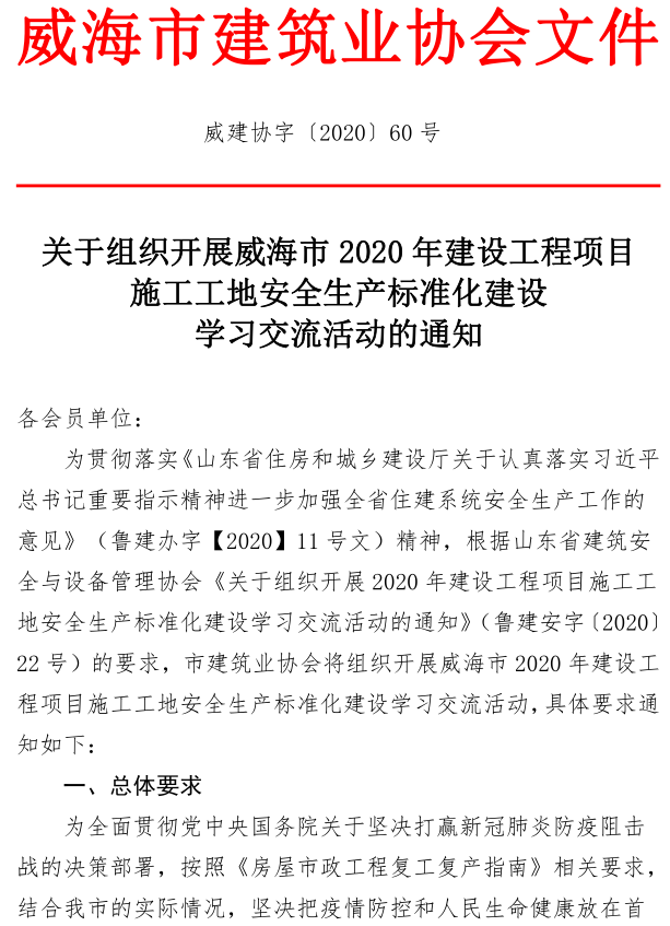 關(guān)于組織開展威海市2020年建設(shè)工程項(xiàng)目施工工地安全生產(chǎn)標(biāo)準(zhǔn)化建設(shè)學(xué)習(xí)交流活動(dòng)的通知