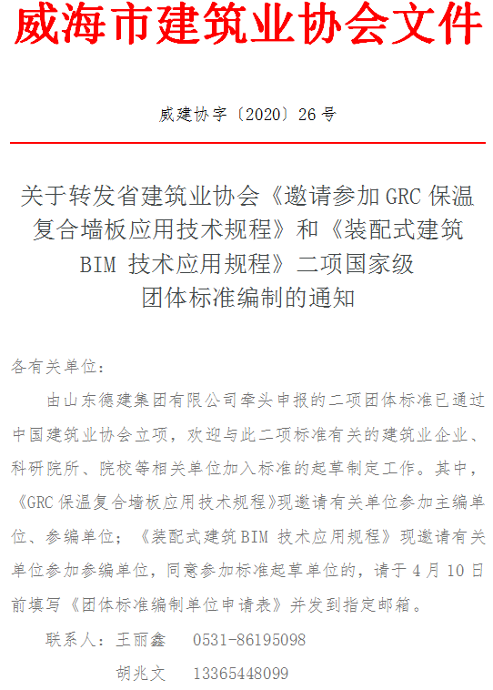 關(guān)于邀請(qǐng)參加《GRC保溫復(fù)合墻板應(yīng)用技術(shù)規(guī)程》和《裝配式建筑BIM 技術(shù)應(yīng)用規(guī)程》二項(xiàng) 國(guó)家級(jí)團(tuán)體標(biāo)準(zhǔn)編制的通知.zip