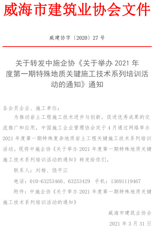 關(guān)于轉(zhuǎn)發(fā)中施企協(xié)《關(guān)于舉辦2021年 度第一期特殊地質(zhì)關(guān)鍵施工技術(shù)系列培訓(xùn)活動的通知》通知