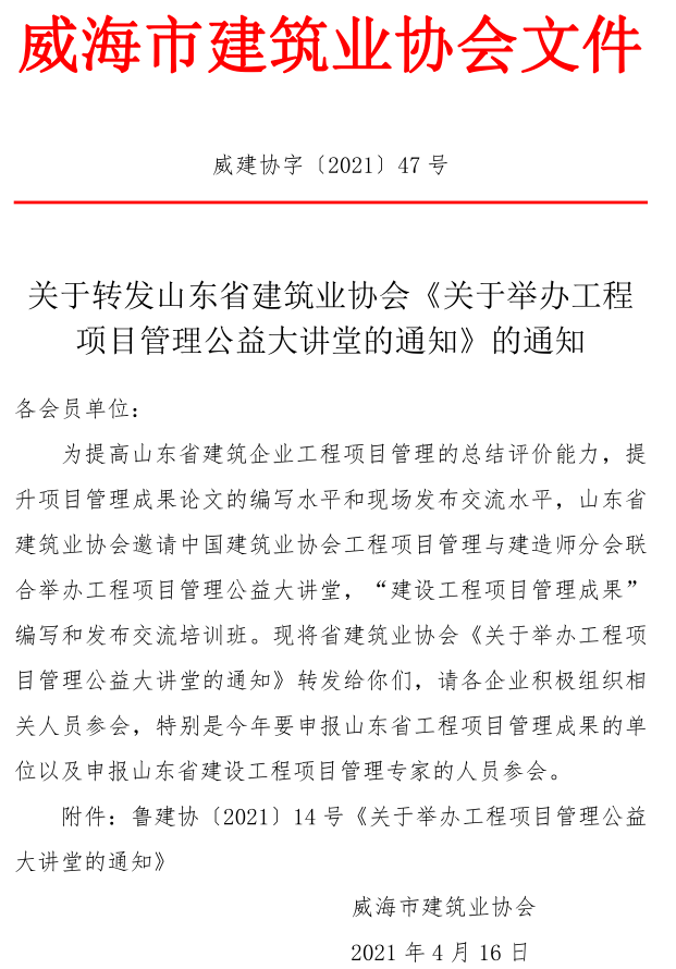 關(guān)于轉(zhuǎn)發(fā)山東省建筑業(yè)協(xié)會(huì)《關(guān)于舉辦工程 項(xiàng)目管理公益大講堂的通知》的通知