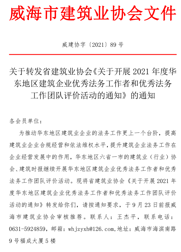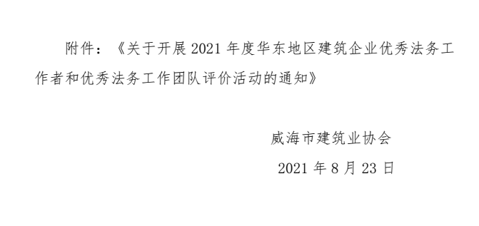 關(guān)于轉(zhuǎn)發(fā)省建筑業(yè)協(xié)會《關(guān)于開展2021年度華東地區(qū)建筑企業(yè)優(yōu)秀法務(wù)工作者和優(yōu)秀法務(wù) 工作團(tuán)隊(duì)評價(jià)活動的通知》的通知