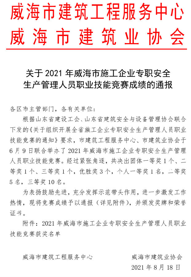 >關(guān)于2021年威海市施工企業(yè)專職安全 生產(chǎn)管理人員職業(yè)技能競(jìng)賽成績的通報(bào)