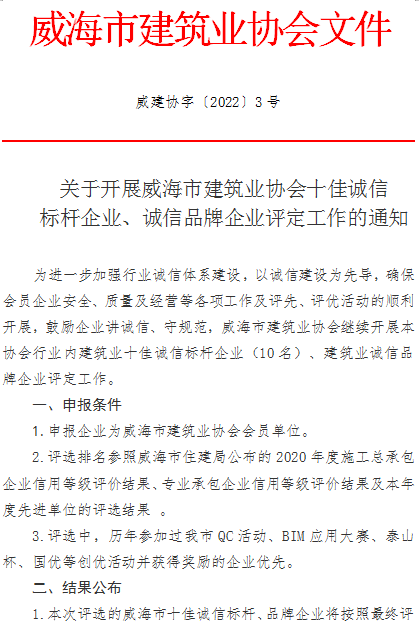 關(guān)于開展威海市建筑業(yè)誠信標(biāo)桿企業(yè)、誠信品牌企業(yè)評定工作的通知