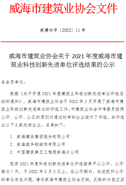 >威海市建筑業(yè)協(xié)會(huì)關(guān)于2021年度威海市建筑業(yè)科技創(chuàng)新先進(jìn)單位評(píng)選結(jié)果的公示