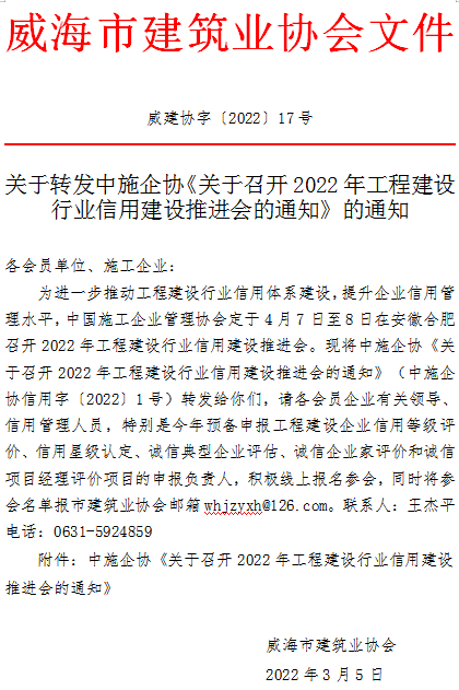 >關(guān)于轉(zhuǎn)發(fā)中施企協(xié)《關(guān)于召開2022年工程建設(shè)行業(yè)信用建設(shè)推進會的通知》的通知