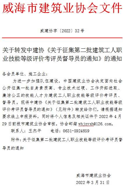 >關(guān)于轉(zhuǎn)發(fā)中建協(xié)《關(guān)于征集第二批建筑工人職業(yè)技能等級評價考評員督導(dǎo)員的通知》的通知