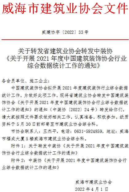 關(guān)于轉(zhuǎn)發(fā)省建筑業(yè)協(xié)會(huì)轉(zhuǎn)發(fā)中裝協(xié)《關(guān)于開展2021年度中國(guó)建筑裝飾協(xié)會(huì)行業(yè)綜合數(shù)據(jù)統(tǒng)計(jì)工作的通知》