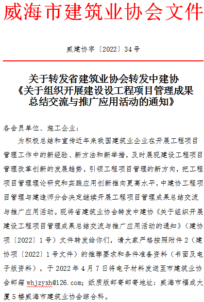 關(guān)于轉(zhuǎn)發(fā)省建筑業(yè)協(xié)會(huì)轉(zhuǎn)發(fā)中建協(xié)《關(guān)于組織開展建設(shè)設(shè)工程項(xiàng)目管理成果總結(jié)交流與推廣應(yīng)用活動(dòng)的通知》