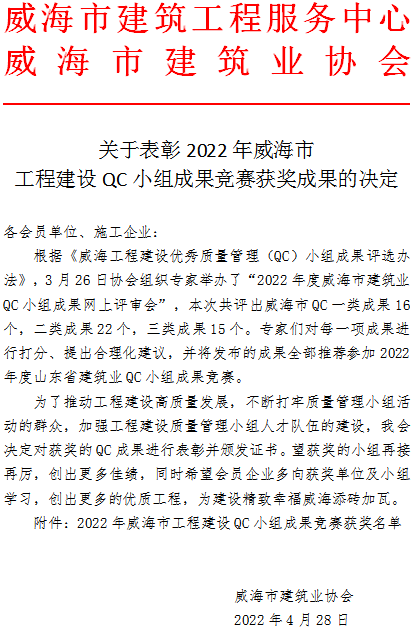 >關(guān)于表彰2022年威海市工程建設(shè)QC小組成果競(jìng)賽獲獎(jiǎng)成果的決定