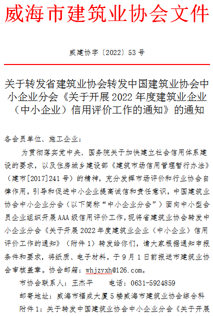 關(guān)于轉(zhuǎn)發(fā)省建筑業(yè)協(xié)會轉(zhuǎn)發(fā)中國建筑業(yè)協(xié)會中小企業(yè)分會《關(guān)于開展2022年度建筑業(yè)企業(yè)(中小企業(yè))信用評價工作的通知》的通知