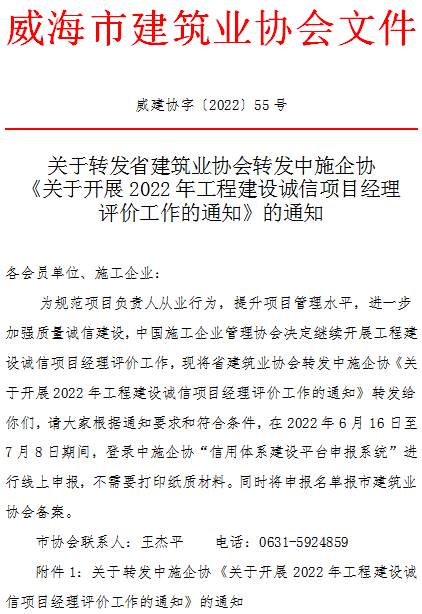 關(guān)于轉(zhuǎn)發(fā)省建筑業(yè)協(xié)會轉(zhuǎn)發(fā)中施企協(xié)《關(guān)于開展2022年工程建設(shè)誠信項(xiàng)目經(jīng)理評價工作的通知》的通知
