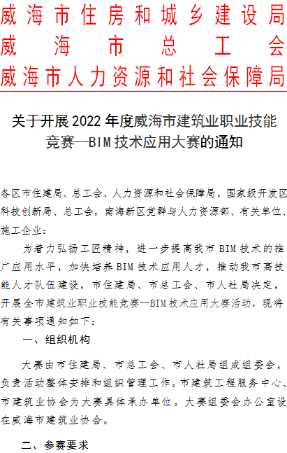 >關(guān)于開展2022年度威海市建筑業(yè)職業(yè)技能競(jìng)賽--BIM技術(shù)應(yīng)用大賽的通知
