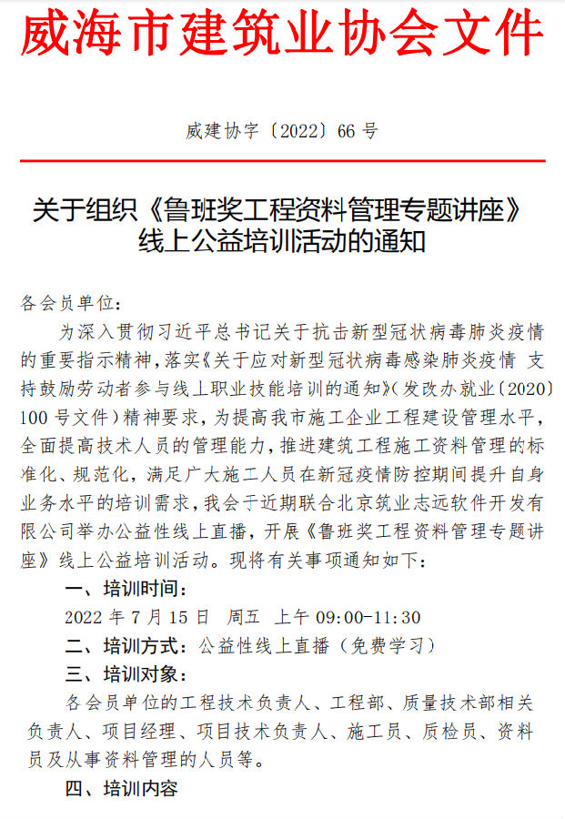 >關(guān)于組織《魯班獎(jiǎng)工程資料管理專題講座》 線上公益培訓(xùn)活動的通知