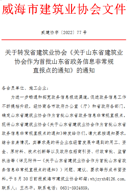 關于轉發(fā)省建筑業(yè)協(xié)會《關于山東省建筑業(yè)協(xié)會作為首批山東省政務信息非常規(guī)直報點的通知》的通知