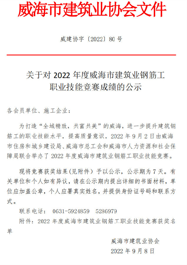 >關(guān)于對2022年度威海市建筑業(yè)鋼筋工 職業(yè)技能競賽成績的公示