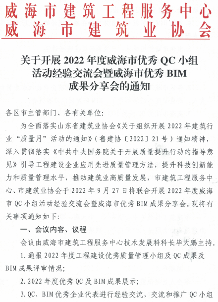 >關(guān)于開展2022年度威海市優(yōu)秀QC小組活動經(jīng)驗(yàn)交流會暨威海市優(yōu)秀BIM成果分享會的通知
