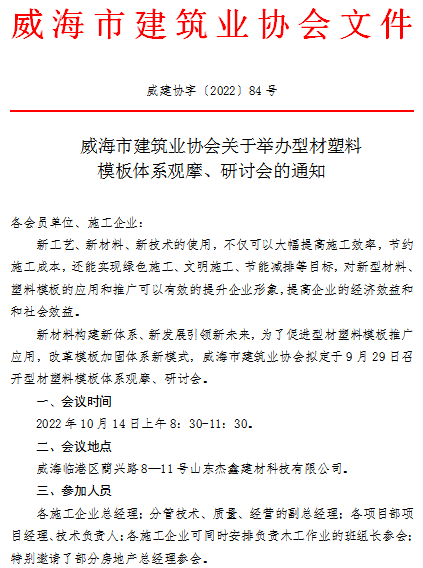 >威海市建筑業(yè)協(xié)會(huì)關(guān)于舉辦型材塑料模板體系觀摩、研討會(huì)的通知