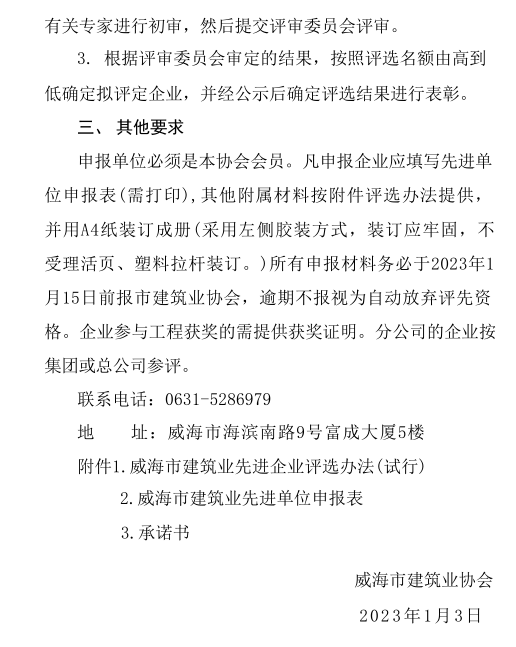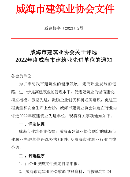 >威海市建筑業(yè)協(xié)會關(guān)于評選 2022年度威海市建筑業(yè)先進單位的通知