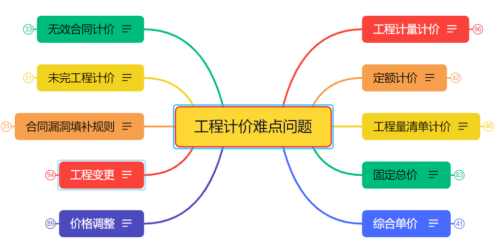 1.涉及工程計(jì)量、定額計(jì)價(jià)、清單計(jì)價(jià)、固定總價(jià)、綜合單價(jià)、價(jià)格調(diào)整、工程變更、未完工程計(jì)價(jià)、無效合同計(jì)價(jià)、計(jì)價(jià)約定不明時的漏洞填補(bǔ)等。