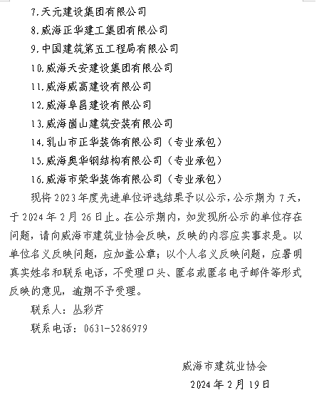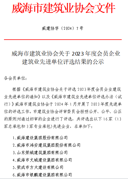 >威建協(xié)字2024年7號(hào)威海市建筑業(yè)協(xié)會(huì)關(guān)于2023年度先進(jìn)單位評(píng)選結(jié)果的公示