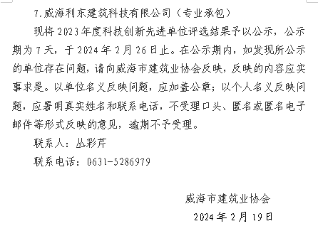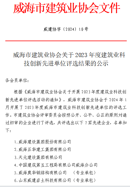 威建協(xié)字2024年10號威海市建筑業(yè)協(xié)會(huì)關(guān)于對2023年度威海市建筑業(yè)科技創(chuàng)新先進(jìn)單位評選結(jié)果的公示