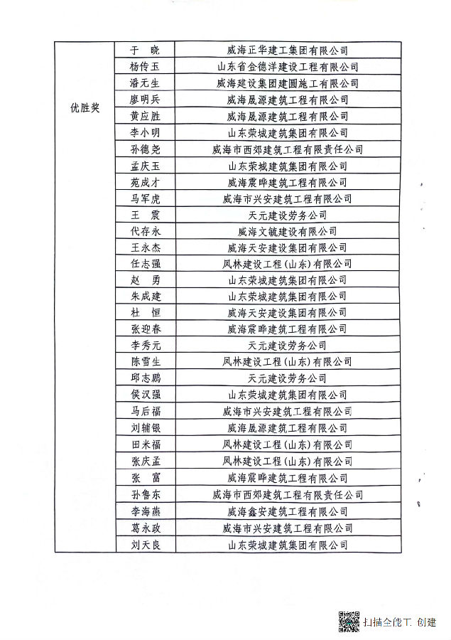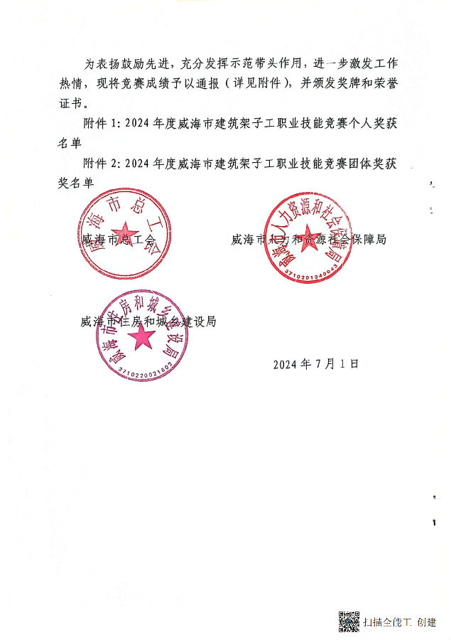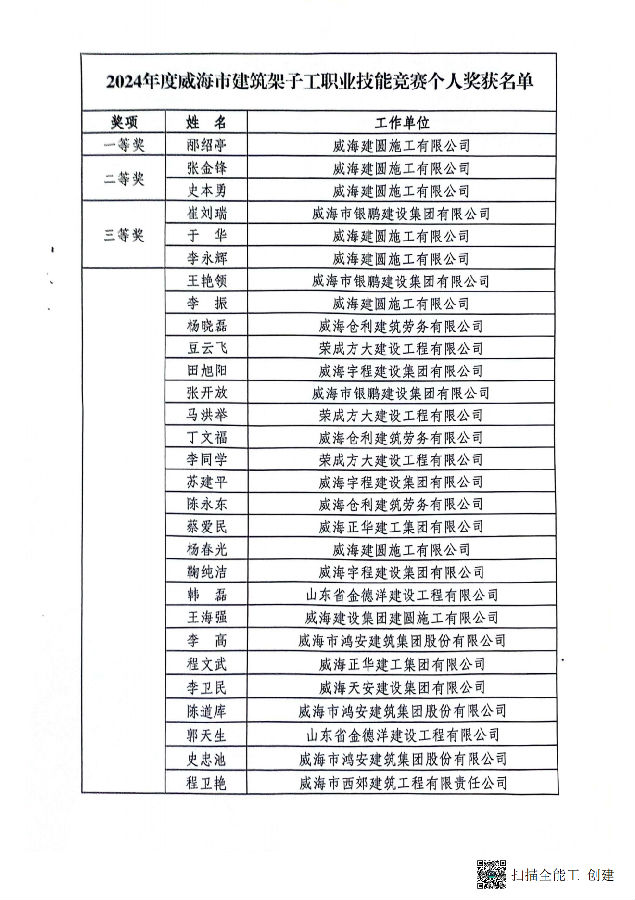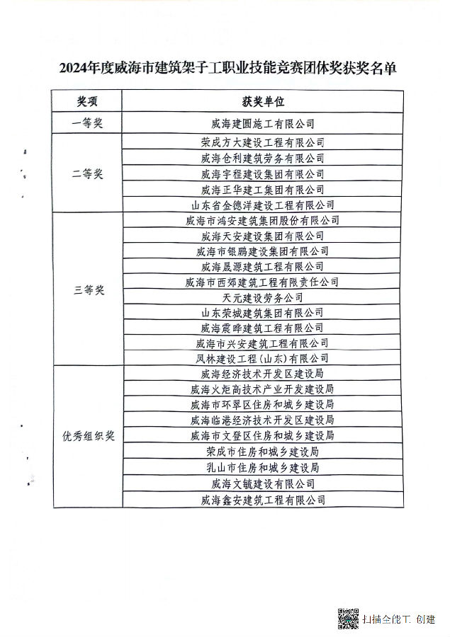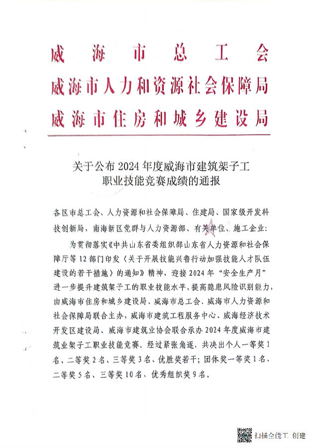 >關(guān)于公布2024年度威海市建筑架子工職業(yè)技能競賽成績的通報(bào)