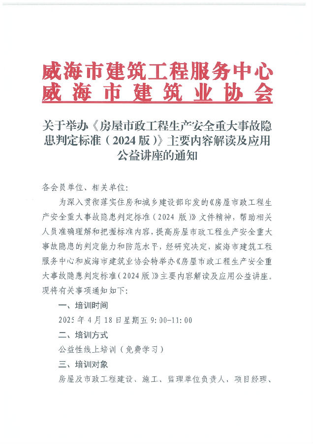 >關于舉辦《房屋市政工程生產(chǎn)安全重大事故隱患判定標準(2024版)》主要內容解讀及應用公益講座的通知