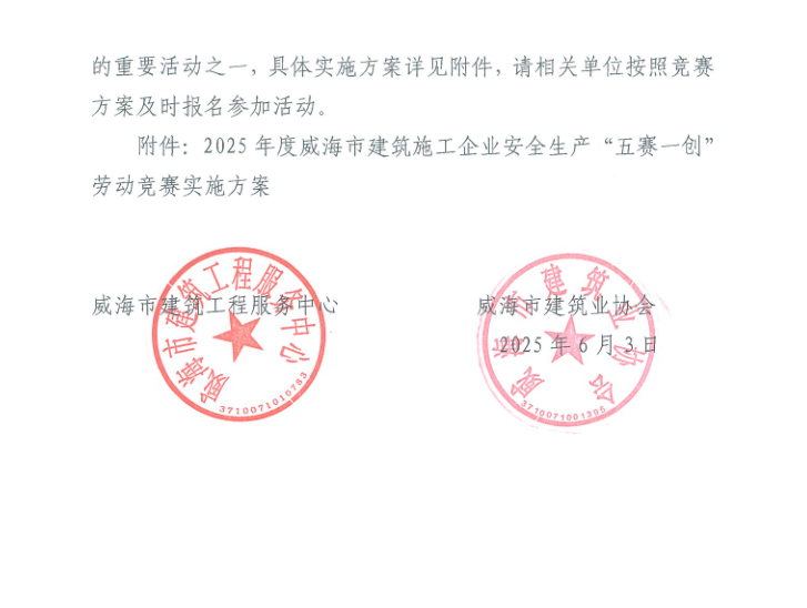 關于開展2025年度威海市“技能興威”職業(yè)技能競賽--威海市建筑施工企業(yè)安全生產“五賽一創(chuàng)”勞動競賽的通知