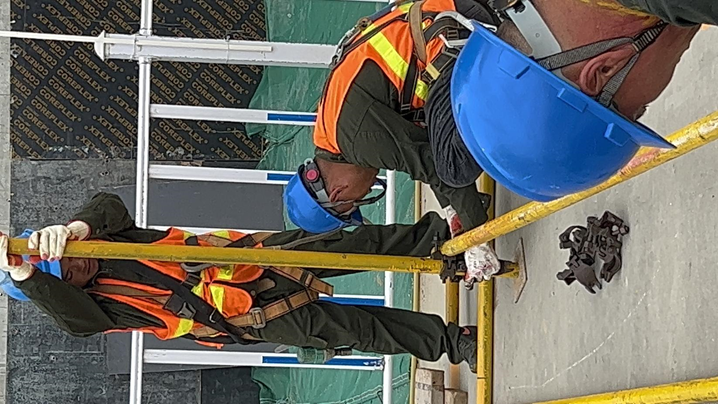 實際操作技能考試分23個小組分三個階段進(jìn)行比賽,參賽人員首先穿戴相關(guān)防護(hù)用品,安全帽安全帶等,每位選手都在規(guī)定的時間能完成防護(hù)用品的穿戴;第二階段-滿堂支撐架的搭設(shè):參賽人員開始按照圖紙搭設(shè)滿堂支撐架,過程中裁判員將對搭設(shè)過程中的規(guī)范操作進(jìn)行動態(tài)評分,搭設(shè)結(jié)束后裁判員對搭設(shè)成果進(jìn)行評分;第三階段-外腳手架的搭設(shè):參賽人員開始按照圖紙搭設(shè)外腳手架,過程中裁判員將對搭設(shè)過程中的規(guī)范操作進(jìn)行動態(tài)評分,搭設(shè)結(jié)束后裁判員對搭設(shè)成果進(jìn)行評分,大賽裁判長宮海波表示,實操競賽的幾個項目綜合考驗了參賽者的搭建的穩(wěn)定、精準(zhǔn)和速度等。